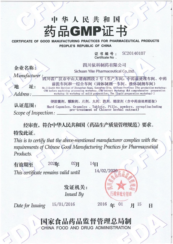 2000年1月,公司通过了国家食品药品监督管理局认证评审中心组织的现场评审检查,取得了公司第一张GMP证书。 其后,公司先后多次投入资金,改建了质管部、综合车间、中药前提车间、口服固体制剂车间等;添置了大量检验和生产设备,进行了多次GMP认证。并且分别于2005年、2010年、2015年通过了GMP重新认证。